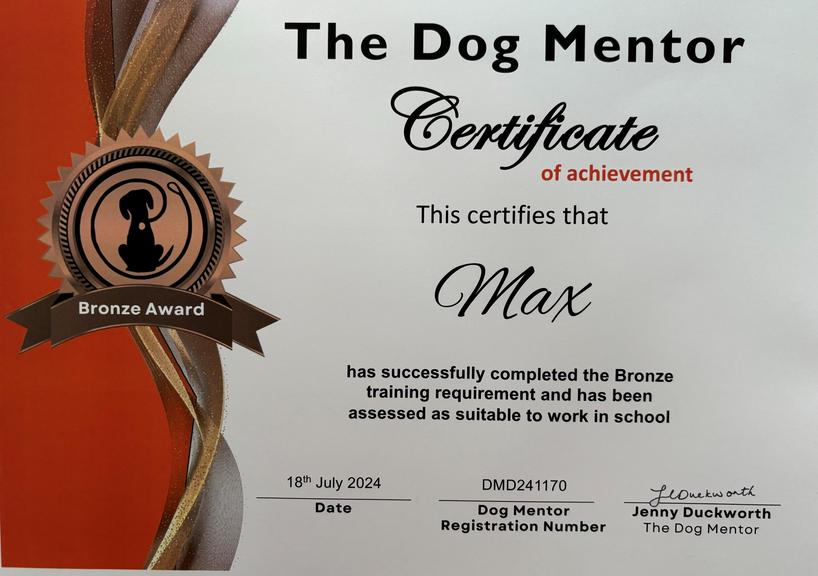 Max is trained, and has been assessed as being suitable to be in school, by 'The Dog Mentor'. The Dog Mentor have provided this Risk Assessment specifically for Max.