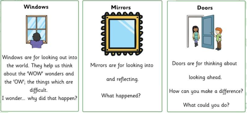 To support everyone’s spiritual development at Harrietsham Church of England Primary School, we use the common language developed by Liz Mills of ‘windows, mirrors, and doors’ in our Collective Worship. This provides opportunities for questioning and experiences for everyone to reflect outwardly, inwardly, and beyond.